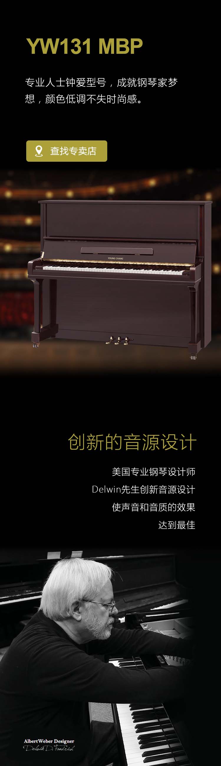 音色试听 最精细的加工工艺 传统典雅的外型 音色圆润和谐且富于变化 音量雄厚、触感灵活、演奏舒适 是一款卓越的大型演奏会使用钢琴 静音 play stop Update Required To play the media you will need to either update your browser to a recent version or update your Flash plugin. 钢琴参数 设计 美国设计师Delwin创新音源设计 音板级别 北美阿拉斯加3A级鱼鳞松实木音板 铁板 真空铸造(V-Process)铁板技术,四方型真空大钢板 钢板涂饰 GOLD 键盘木 A级椴木 黑键 防滑抗菌材质轻松演奏 琴弦 德国勒斯劳琴弦 榔头木 MAPLE 榔头毛质 进口羊毛毡冷压粘接 垫弦轴 中低音部(半孔) 尺 寸 155cm*131cm*60cm 重 量 240kg 颜 色 统一销售价 37500元